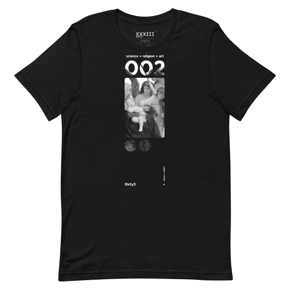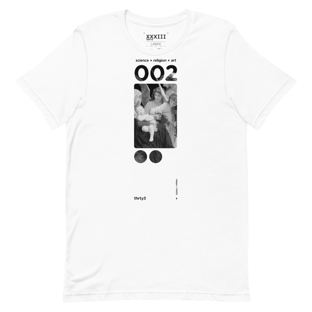 “Religion” is the 2nd design from the science + religion + art collection. A short sleeve t-shirt with a large print on the front.