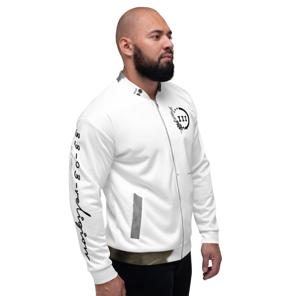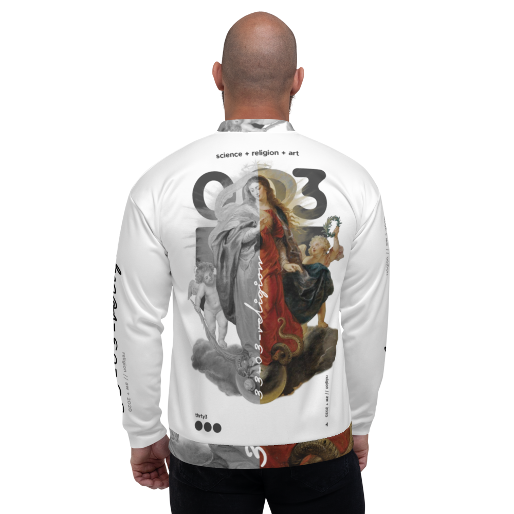 Science + Religion + Art “Religion” Unisex Bomber Jacket. Wear it on a basic t-shirt, or layer it on top of a warm hoodie—it’ll look great either way. With a brushed fleece inside, and a relaxed fit.